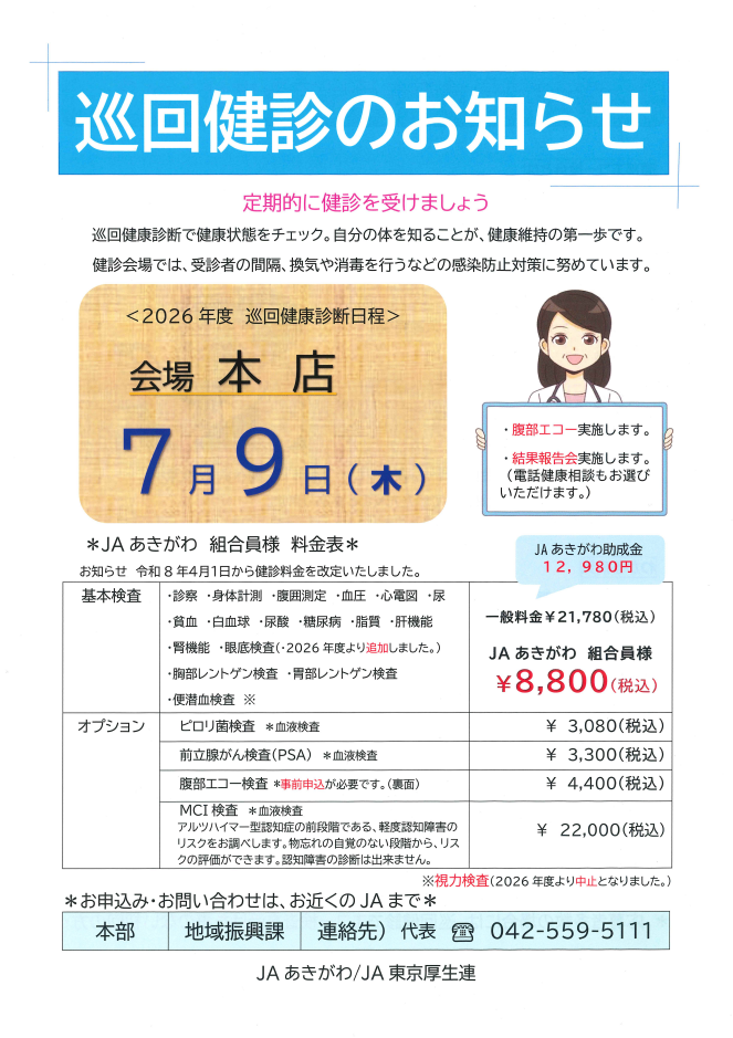 JAあきがわでは、組合員・地域の皆さまに充実した生活を送っていただくために、年に1回、本店にて巡回健診を行っています。後日、結果票をお持ちいただいての保健師による健康相談も行っております。